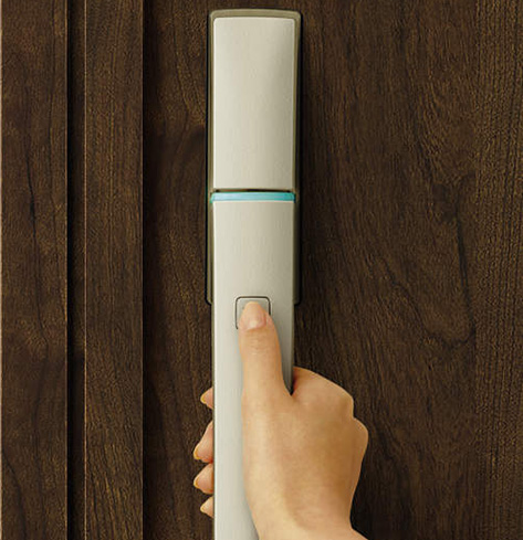 毎日のお出かけをスムーズに。玄関ドアはポケットキー対応で、ハンドルのボタンを押すだけで施解錠。