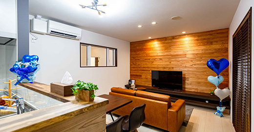 店舗内に併設のモデルルームに、ウッズハウスの特徴的で人気のDIYアイディアを盛り込みました。シンプルなLDKを、あなただけの特別感のある空間にする工夫をお楽しみください。
