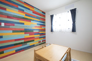 子供部屋に施されたカラー杉板は見ているだけでワクワクします。