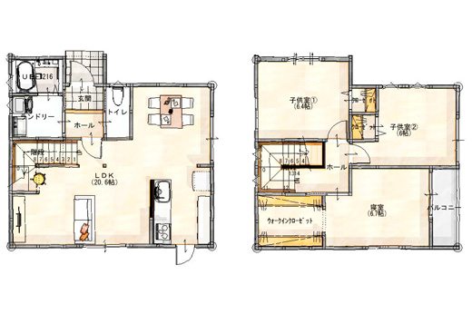 LDKは20.6帖の広々空間。DIYによる独創的な空間演出と開放感で、自分だけの特別なくつろぎ空間となっています。2階はたっぷり収納がポイント。2つある子供部屋では、それぞれ違った個性を体感いただけます。